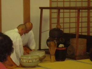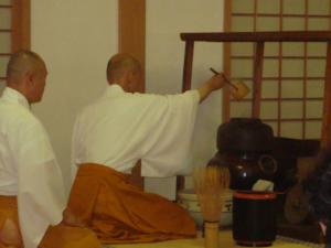 棗から孫の手のような茶杓でお茶を入れ点てる